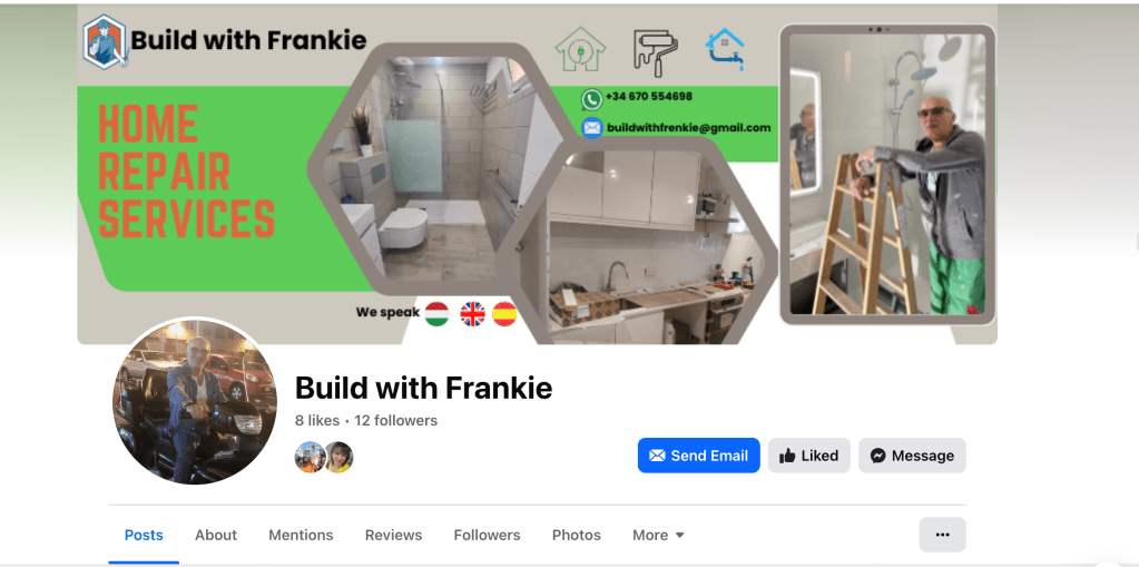 Frankie, un manitas británico con gran talento, me pidió que creara su marca desde cero. Diseñé su logotipo, configuré su página de Facebook y comencé a aumentar su visibilidad local compartiendo su trabajo y promocionando sus servicios en grupos comunitarios relevantes. Ahora llega a potenciales clientes en toda la isla.